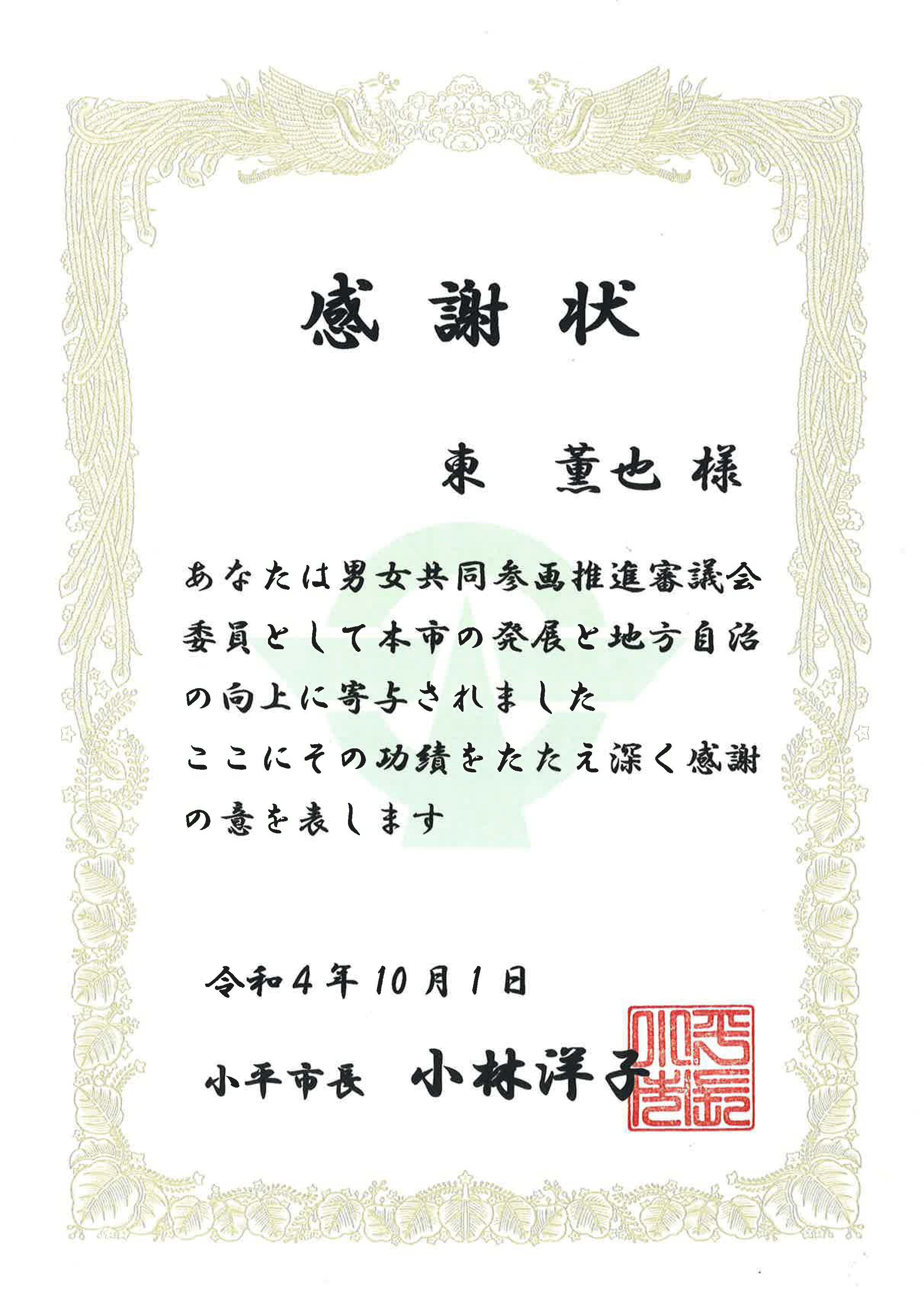 小平市制施行60周年記念式典が、令和4年10月1日(土)ルネこだいら 大ホールで挙行され、当社代表(代表取締役 東 薫也)が自治協力者(男女共同参画推進審議会委員)として、小平市の発展と地方自治の向上に寄与したとして感謝状を贈呈されました。